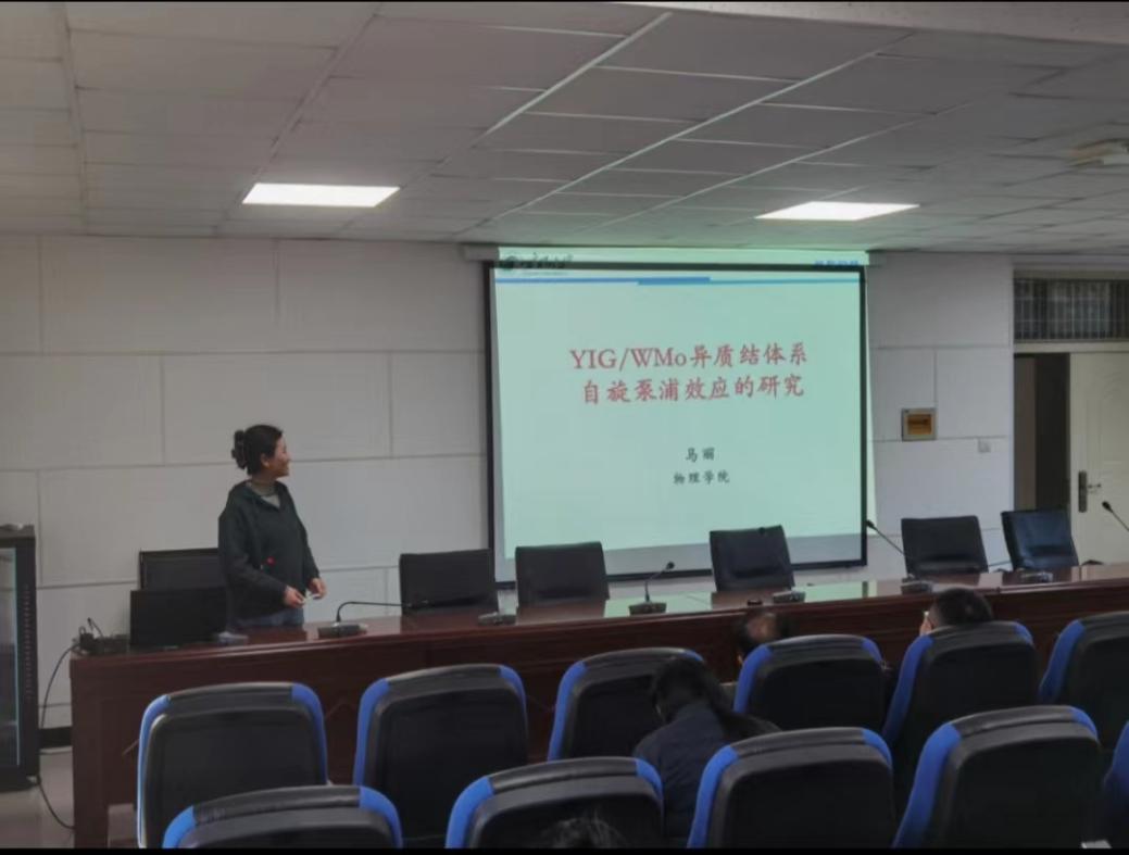 2023年11月9日下午,成人影片 马丽和张曜勃两位老师在博远楼217为成人影片 教师分别作“YIG/WMo异质结体系自旋泵浦效应的研究”和“高能粒子物理中最核心的观测量一散射振幅”专题报告会。