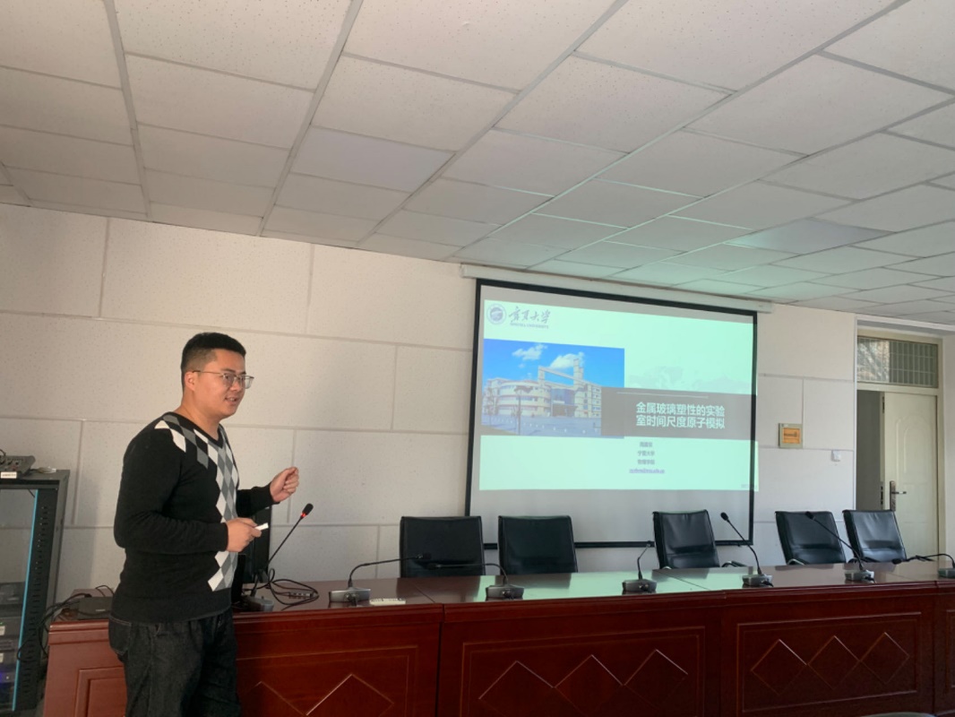 2023年11月22日下午,成人影片 周震亚老师和黄永巍老师在博远楼217为成人影片 教师作“金属玻璃塑性的实验室时间尺度原子模拟”和“拓扑绝缘体量子点中的太赫兹辐射”专题报告会。