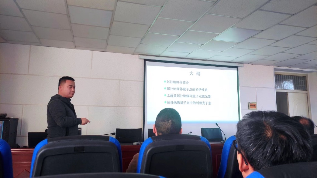 黄永巍老师报告介绍了二维拓扑绝缘体的基本概念、拓扑量子点的能带结构和光学性质,以及基于拓扑量子点构建的几种太赫兹激光源和纠缠光子源,同时介绍了拓扑量子点中的激子及其精细结构。报告深入浅出,内容丰富。