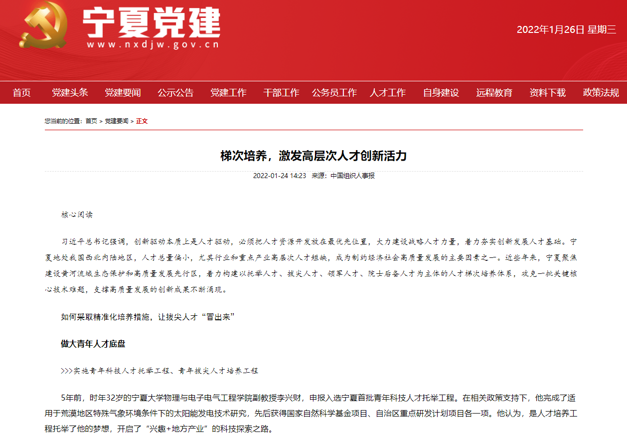 据宁夏党建网消息,近日《中国组织人事报》以《梯次培养,激发高层次人才创新活力》为标题,专版介绍了宁夏高层次人才培养政策。在该文中,全面介绍了宁夏着力构建以托举人才、拔尖人才、领军人才、院士后备人才为主体的人才梯次培养体系,支撑建设黄河流域生态保护和高质量发展先行区的“人才驱动”战略情况及其成果。成人影片 李兴财博士作为首批“宁夏青年科技人才托举工程”人选的典型代表获得该文关注。