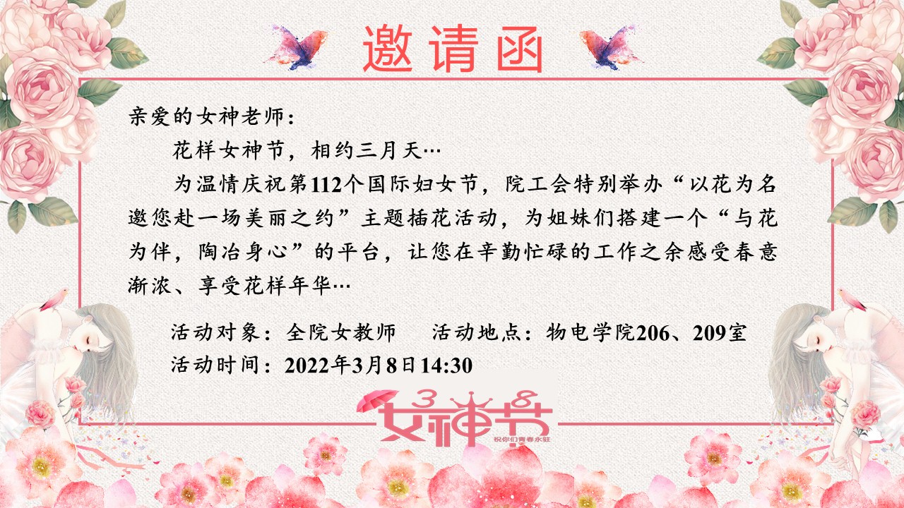 此次插花活动搭建了一个“与花为伴,陶冶身心”的平台,不仅丰富了学院女教工的业余生活,也提升了女教工的审美品味。在活动中,每一位女教工展示了独特的插花技能和自我魅力,气氛热烈、其乐融融……学院分工会精心设计制作了美丽的邀请函及祝福卡,表达学院对女教工崇高的敬意和诚挚的问候!