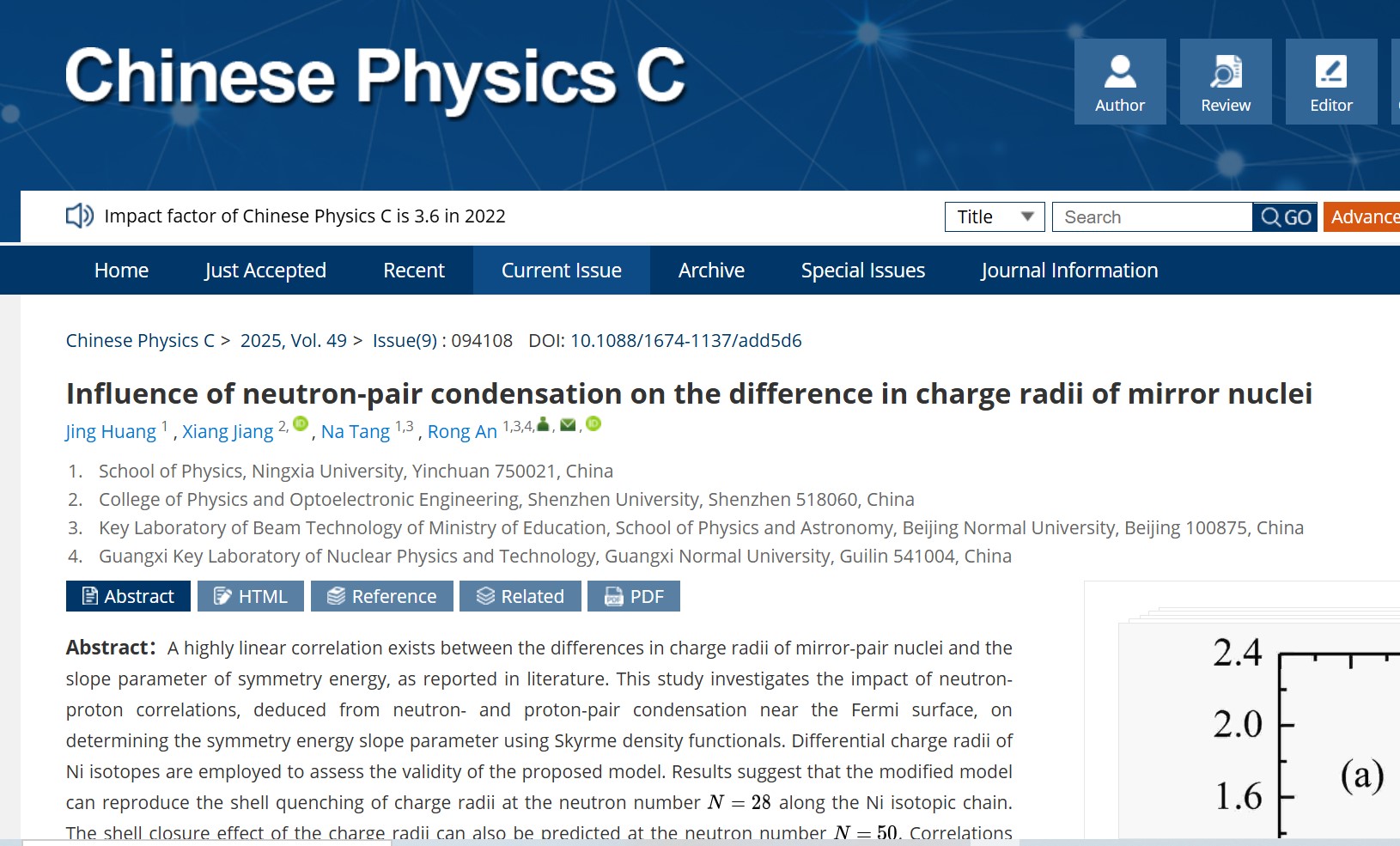 2025年9月11日,成人影片 本科生黄精(学号:12021241908,现为海南大学物理与光电工程学院硕士研究生)与深圳大学蒋翔博士、成人影片 唐娜博士和安荣博士,在国际核物理期刊《Chinese Physics C》上发表题为《Influence of neutron-pair condensation on the difference in charge radii of mirror nuclei》的原创性论文。文章中考虑了中子对凝聚对镜像核电荷半径差值与对称能斜率之间关联性的影响,研究发现,考虑中子对凝聚后得到了比较硬的核物质状态方程(EoS)。该论文在线发表时间为2025年5月8日,黄精为该论文的第一作者,安荣博士为该论文的唯一通讯作者,成人影片 为该论文的第一通讯单位。《Chinese Physics C》为粒子物理与原子核物理专业国际英文期刊,目前影响因子3.1(2024年),中科院分区为二区,JCR分区为Q1/Q2,在核物理领域具有非常高的认可度。
