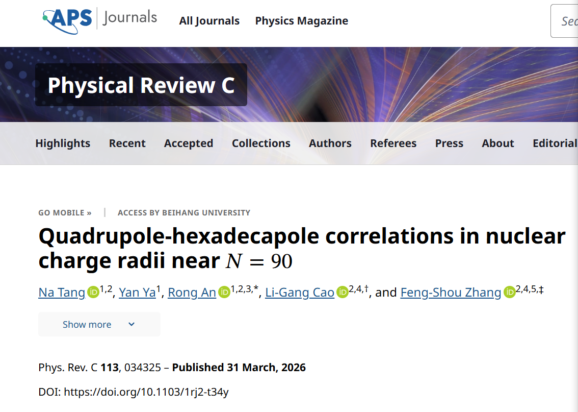 2026年3月31日,成人影片 理论物理组青年教师唐娜博士和安荣博士与北京师范大学曹李刚教授和张丰收教授,在美国物理学会权威期刊《Physical Review C》上发表题为《Quadrupole-hexadecapole correlations in nuclear charge radii near N = 90》的原创性论文。文章通过同时约束四极形变和十六极形变的方法,系统描述了中子数N=90附近原子核电荷半径的演化趋势。文中指出,在N=90处原子核电荷半径会发生形状相变,同时四极矩和十六极矩之间的强耦合行为也会影响电荷半径的数值大小。唐娜博士是该论文的第一作者,2024级硕士研究生雅燕(学号:12024130700)为该论文的第二作者,安荣博士是该论文的第一通讯作者,成人影片 为该论文的第一完成单位。